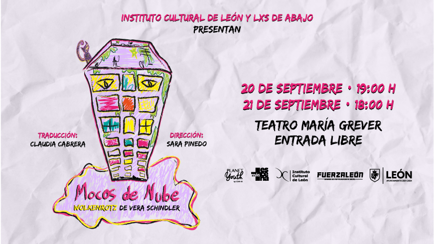 El Instituto Cultural de León te invita a la presentación de Mocos de Nube una obra de tratro dirigida por Colectivo Lxs de Abajo, los días 20 de septiembre a las 19:00 horas y 21 de septiembre a las 18:00 horas en el Teatro María Grever.